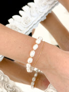 Featuring luminous 8–9mm white baroque freshwater pearls, accented with delicate gold-filled beads and a meaningful cross charm, this bracelet is more than an accessory—it’s your daily reminder that peace is your true power.
