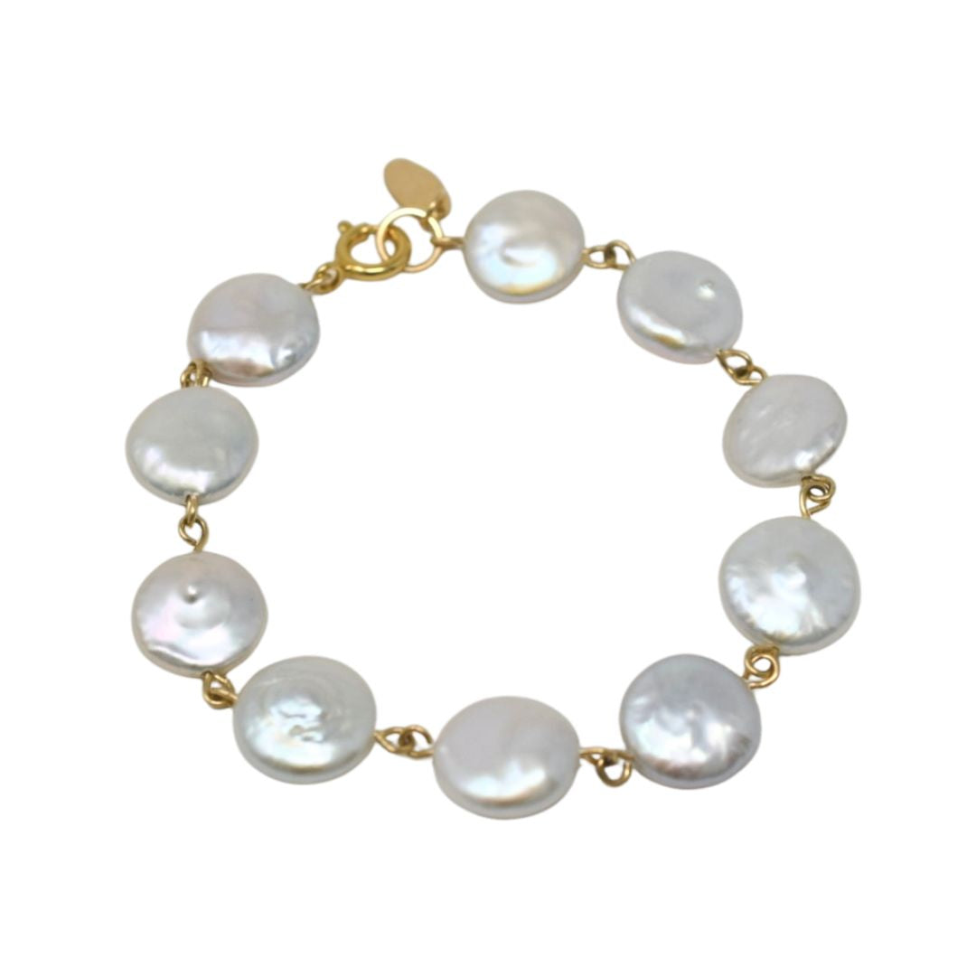 With luminous 10–11mm white baroque freshwater coin pearls strung on a delicate gold-filled wire and clasp, it’s a timeless piece that catches the light—and the hearts—of all who see it.