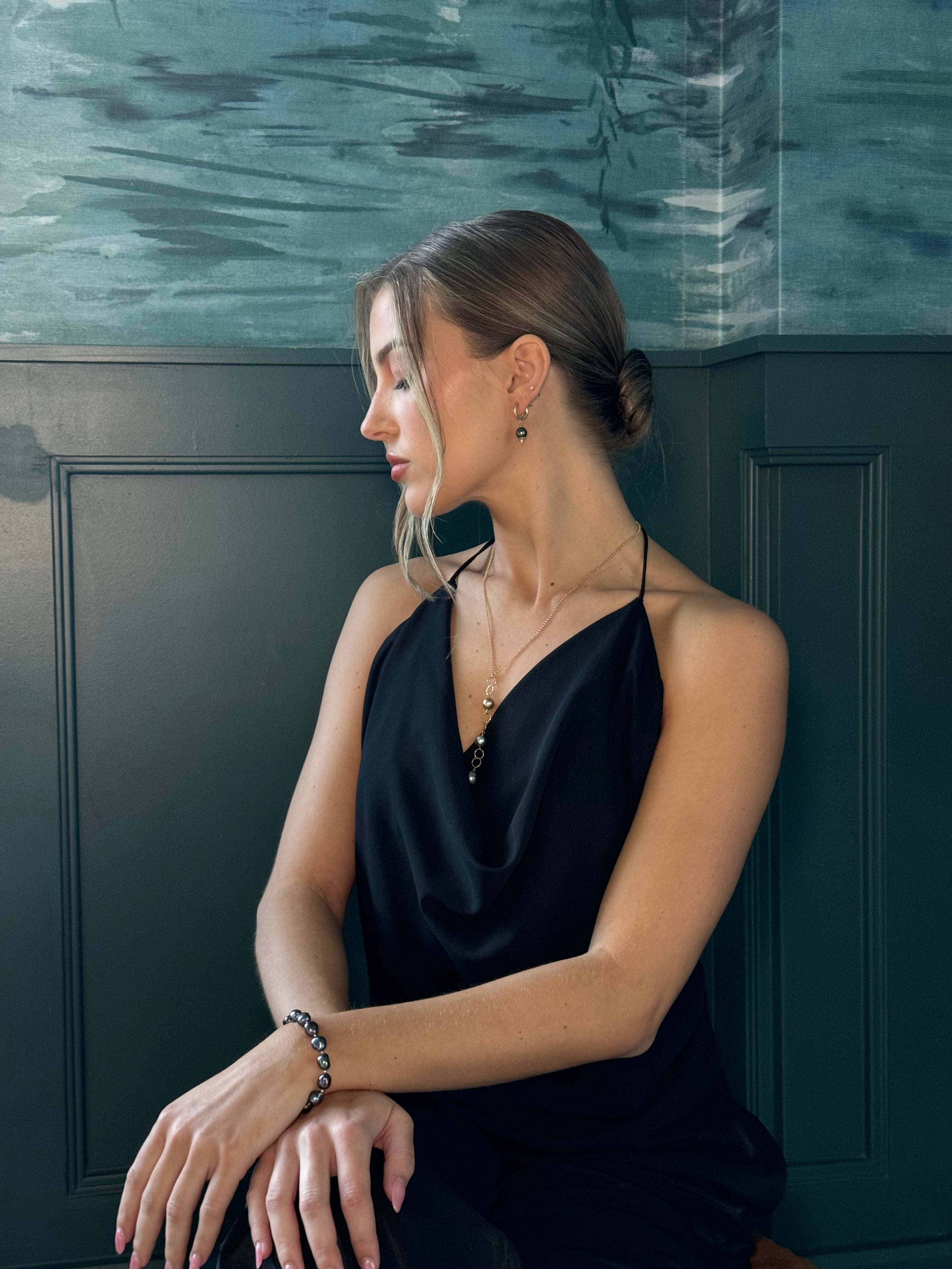 A one-of-of-a-kind sexy cascade of graduated, ombre colored Tahitian pearls on a 14k gold filled chain. Wear it with deep-V necklines, or over your favorite crew. It's beautiful with white, black and jeweled tones.