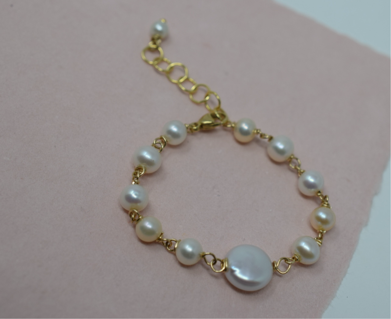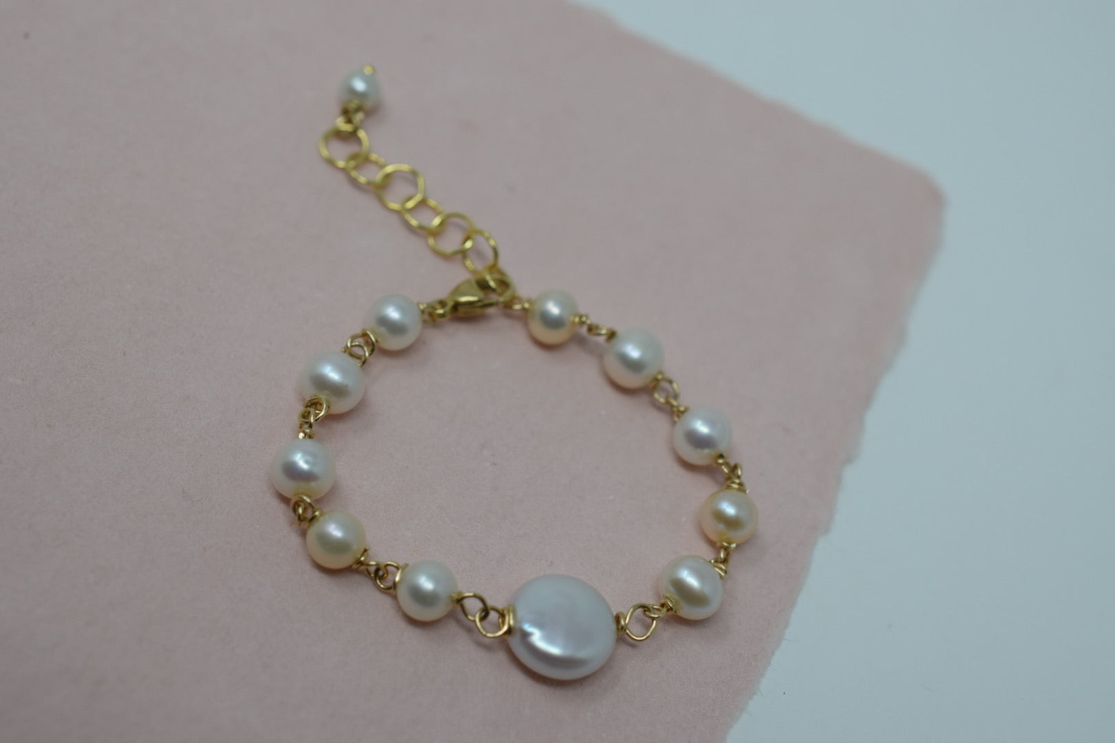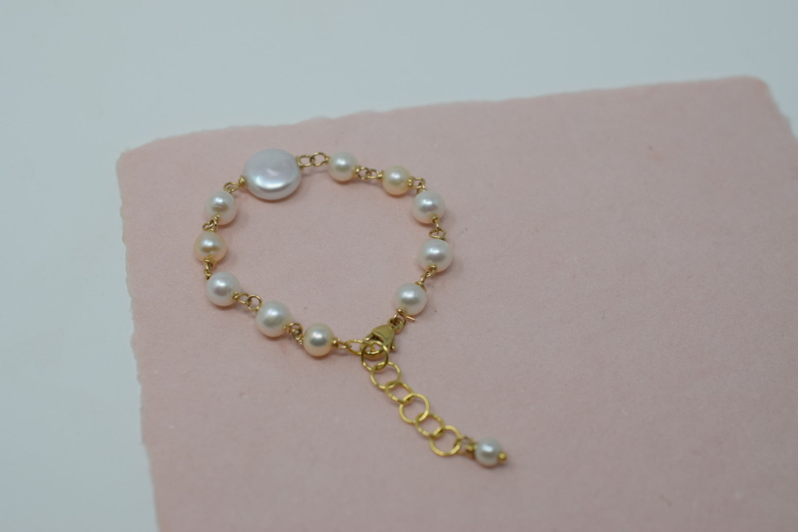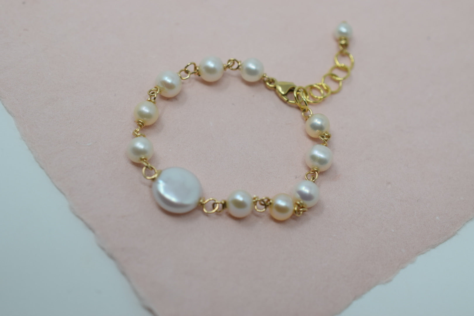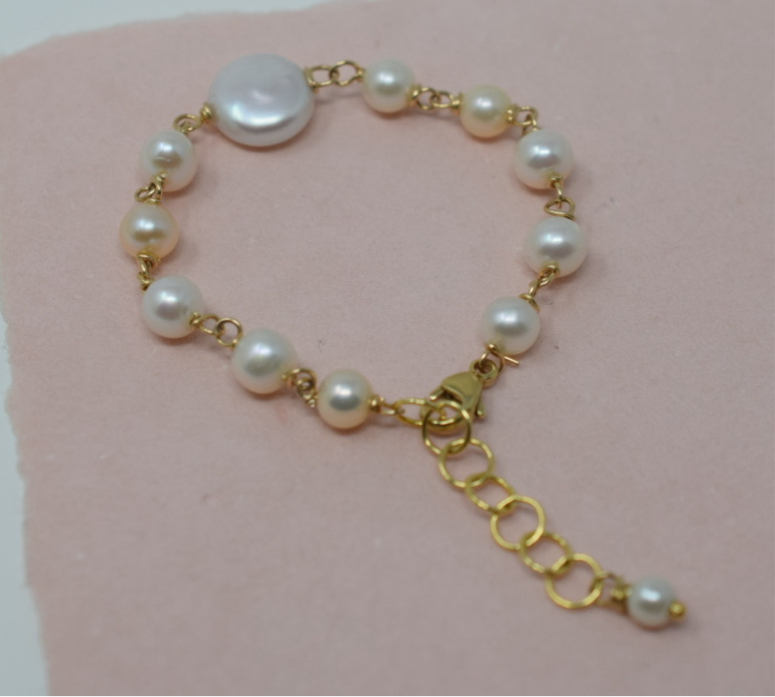 A tiny, freshwater cultured pearl & 14k gold filled bracelet for your precious little one. Handcrafted with baby white pearls (with pink overtones), a white round coin pearl centerpiece and 14k gold filled incidentals.