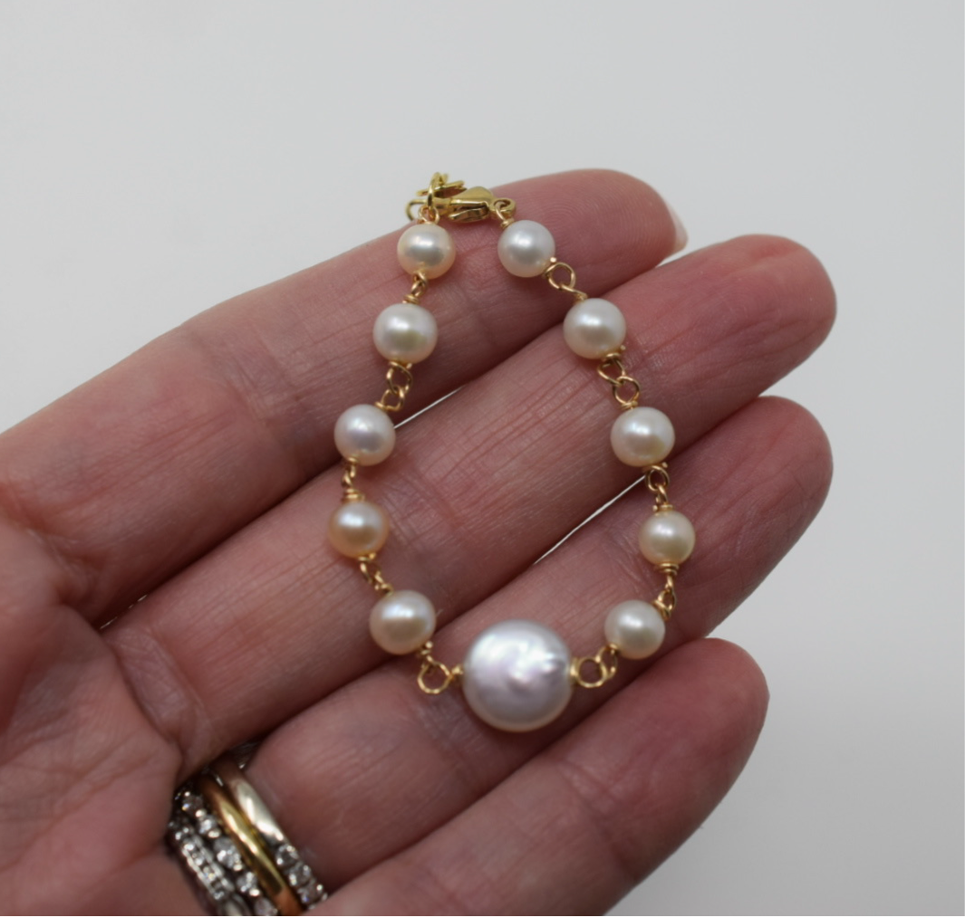 5mm cultured pearls, 10mm round coin pearl, 14k gold filled wire & lobster clasp.