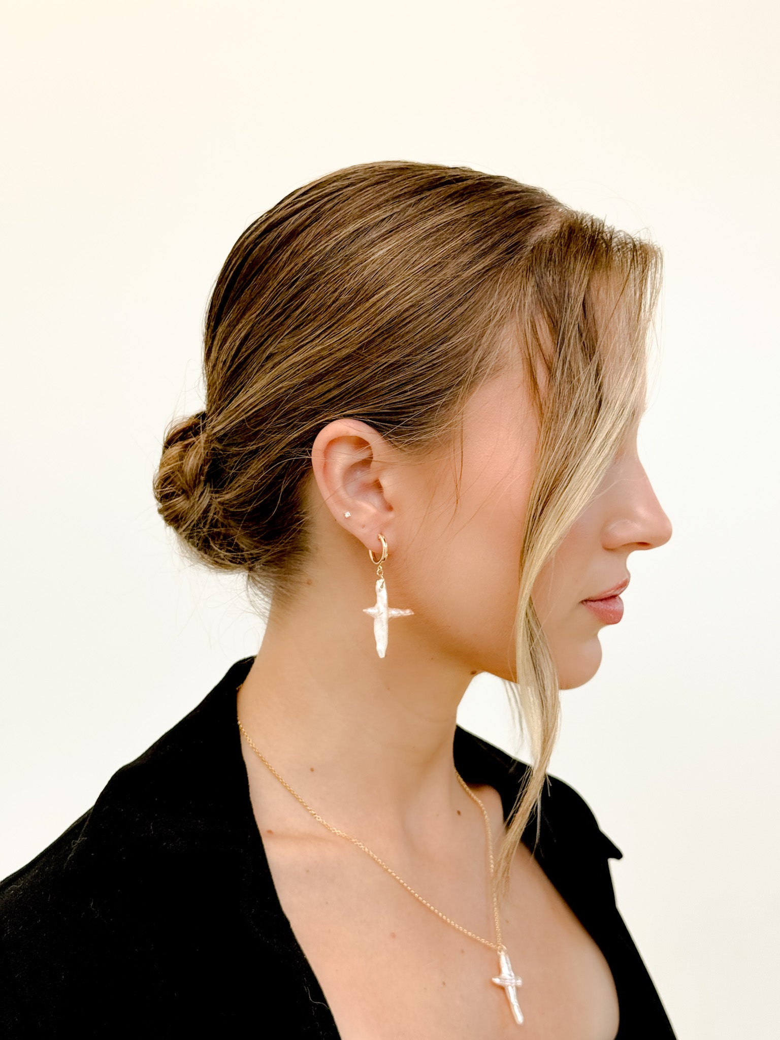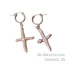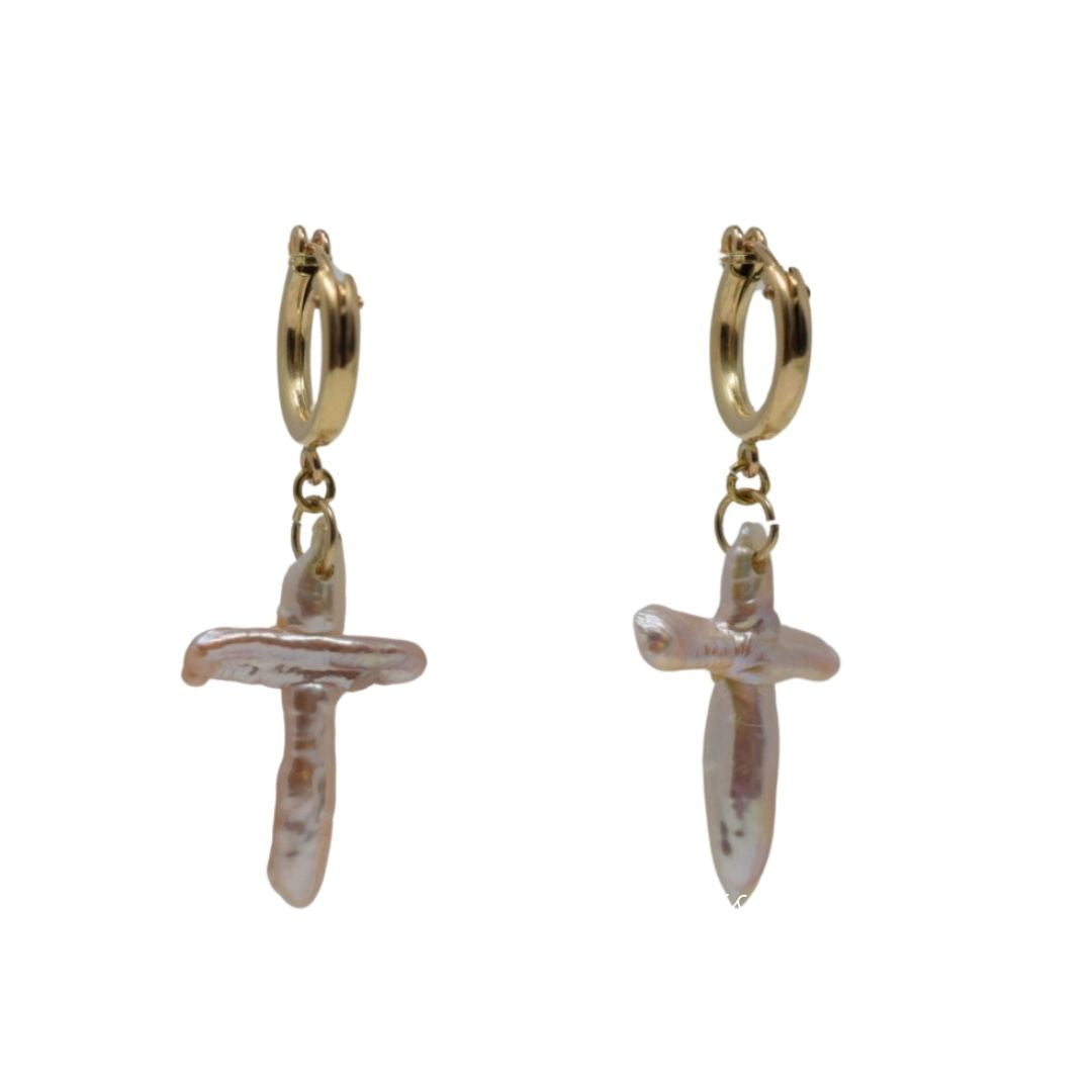 The No Greater Love Earrings are striking, one-of-a-kind statements handcrafted with reverence and intention. Featuring luminous 1.25" cross pearls with soft pink-champagne undertones, each pair is finished with your choice of 14k gold-filled or sterling silver hoops.